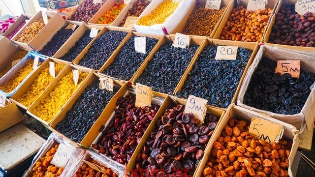 Qozun kilosu 3-6 AZN, qoz ləpəsi 14-15 AZN; fıstıq ləpəsi 7 AZN; fındığın kilosu 5-7 AZN, fındıq ləpəsi – qabıqsız 14 AZN, qabıqlı 12 AZN; şabalıd 9-10 AZN; ağ kişmiş 6 AZN, qara kişmiş 9 AZN; iydə 8 AZN; innab 3,50-12 AZN; ərik qurusu 18 AZN; alça 6 AZN; albuxara 8 AZN; nar 1-1,50 AZN, portağal 2 AZN, almanın 3 kilosu 1 AZN, 1 kilosu 2 AZN; kivi 2, 80 AZN; pomidor 4 AZN; xiyar 2,80 AZN, kartof 1,1.10 AZN, soğan 1 AZN, badımcan 2 AZN, kələm 0, 40 AZN, yumurta 0,30 AZN-ə satılır.