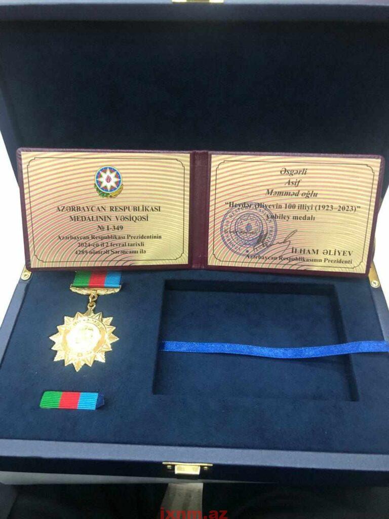 Ölkə Prezidenti cənab İlham Əliyevin Sərəncamı ilə YAP İdarə Heyətinin üzvü Asif Əsgərli “Heydər Əliyevin 100 illiyi (1923-2023)” Azərbaycan Respublikasının yubiley medalına layiq görülmüşdür.