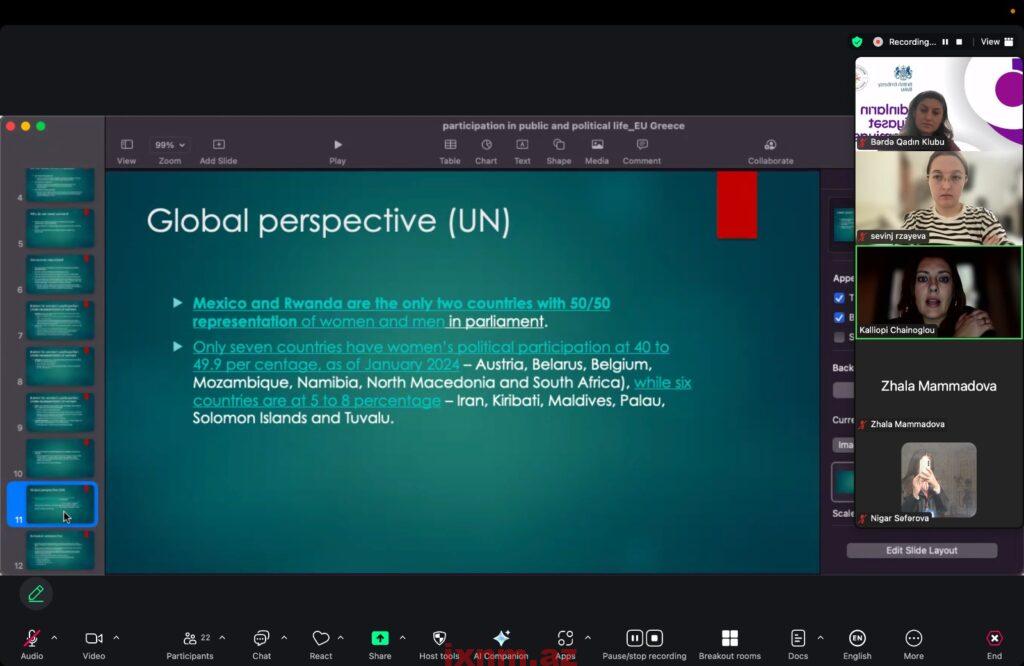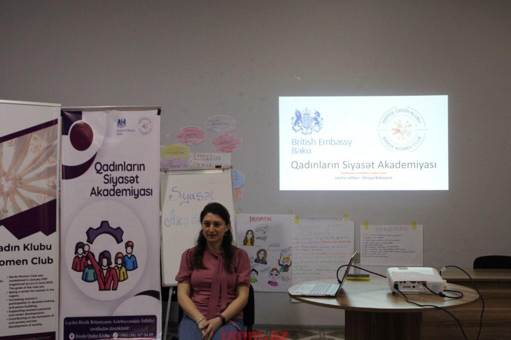 Bərdə Qadın Klubu tərəfindən icra edilən və ümumilikdə regionlarda yaşayan 20 qadının cəlb edilməsi ilə həyata keçirilən “Qadınların Siyasət Akademiyası” layihəsi bu ilin fevral ayında yekunlaşıb. Layihə çərçivəsində regionlarda yaşayan qadınların siyasi savadlılığının artırılması, onların sözügedən sahə üzrə vacib olan bilik və bacarıqlara yiyələnməsi və siyasətdə qadın iştirakçılığının artırılması məqsədilə, müxtəlif mövzularda təlimlər, görüşlər keçirilib. Bununla yanaşı, iştirakçıların praktik bacarıqlar əldə etməsi məqsədilə regionlardakı siyasi institutlarla yanaşı, təhsil qurumlarına da öyrənmə səfərləri təşkil edilib.